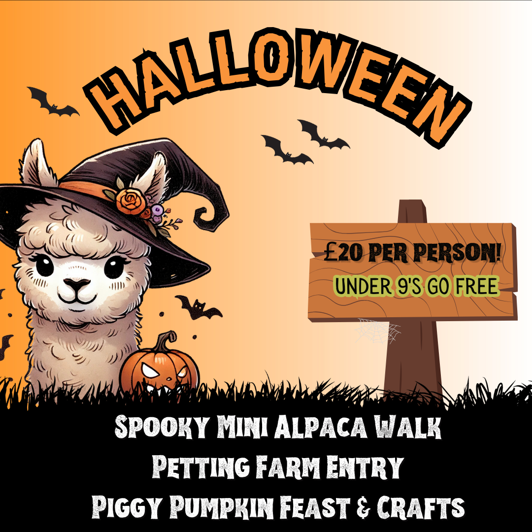 Mini Alpaca Walks (30 minutes) – Take one of our friendly alpacas for a stroll with a Halloween twist!